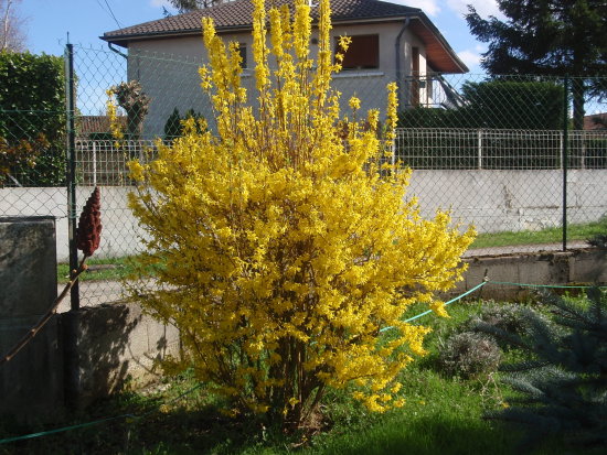 Đó là cây Forthysia, tức cây Liên kiều cho hoa màu vàng như hoa mai nhưng cánh nhọn chứ không tròn, theo thiển ý thì không đẹp bằng hoa mai vàng dù về mùa Xuân Forthysia cũng kết nụ đơm bông vàng rực rỡ nhìn xa cũng giống như mai vàng, khi hoa tàn thì mới ra lá giống như mai.