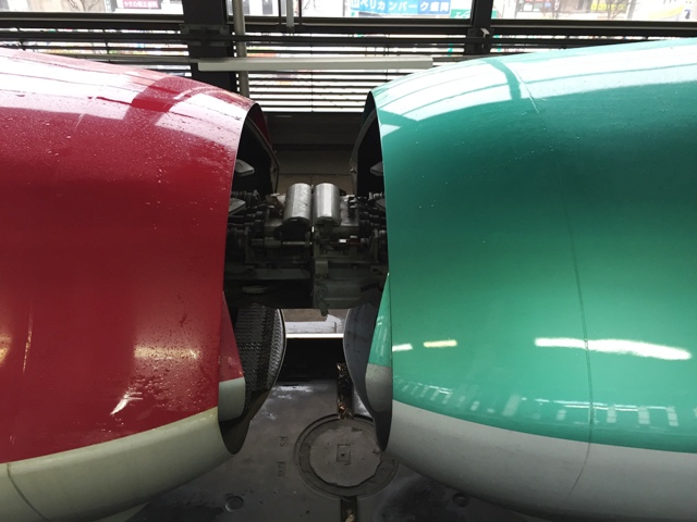 Nhưng câu chuyện Shinkansen không ngừng ở đây. Trên chuyến xe đi lên miền Tohoku, khi đến thành phố Morioka đoàn xe được tách rời làm hai tại nhà ga Morioka. Sau đó, đoàn xe phía trước sẽ tiếp tục đi về phía bắc đến Aomori, đoàn phía sau sẽ hướng về thành phố Akita phía bờ tây Nhật Bản. Tôi dự đoán sẽ có những tiếng "cành cạch" tháo rời làm rung chuyển đoàn xe. Nhưng không, việc tách rời xảy ra êm thắm không một tiếng động. Ngồi trong xe, thật sự tôi không hiểu đoàn xe đã được tách ra như thế nào. Vài ngày sau, khi trở lại nhà ga Morioka tình cờ tôi mục kích một sự kiện ngược lại là hai đoàn xe Shinkansen đang ráp hai đầu vào nhau. Cái "móc" của xe là một bộ phận cơ điện mang đầy bộ cảm biến (Hình 2). Hai đoàn xe từ từ xê dịch cho đến khi hai cái móc nhẹ nhàng liên kết vào nhau như hai chiếc tàu vũ trụ "docking" trong không gian. Tất cả hoàn tất trong vài phút. Đoàn xe dài ngoằn gấp đôi như con rắn khổng lồ điềm nhiên phi mã hướng về Tokyo với vận tốc 300 km/h.