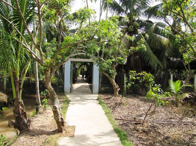 Bước xuống chiếc xe lôi, theo ông cháu ông Châu đi qua chiếc cầu bằng bê tông bắc ngang qua rạch nước chạy dọc theo đường lộ liên tỉnh. Chúng tôi vào con đường đất khô ráo, khá rộng, đi khoảng vài chục mét. Quẹo vào con đường rẽ riêng biệt dẫn đến một căn nhà ngói bề thế đứng giữa một khu vườn cây ăn trái rộng lớn. Vách và mái nhà vẫn còn màu nguyên thủy, chứng tỏ căn nhà xây cất không lâu. Hình như thấu hiểu được sự ngạc nhiên của tôi khi nhìn thấy cơ ngơi đồ sộ của mình, ông Châu không giấu được vẻ sung sướng, tự hào, quay sang tôi ông nói: