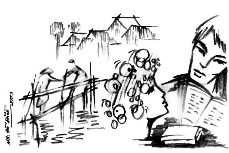 - Đúng thế, làm thơ thì phải giàu tưởng tượng mà em. Như tuần trước, trong lúc cắt cỏ vào một buổi chiều nắng, trời nóng đến chảy mồ hôi, bụi và rác bay tối tăm cả mày mặt, nhưng anh cũng vẫn tìm được ý cho bài thơ Gió bụi một cuộc tình đấy.