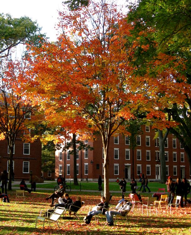 Harvard tuy mang đậm nét cổ kính, nhưng lại rất gần gũi với thiên nhiên. Khuôn viên có rất nhiều cây trồng và sân cỏ, nét độc đáo là trên những sân cỏ đó, không phải là những băng ghế đá như các nơi khác, mà là những chiếc ghế đơn đủ màu sắc đặt rải rác đó đây trong sân, để hòa đồng với sắc Thu đủ màu chung quanh chăng? hay để mang lại nét tươi vui cho khung cảnh đại học cổ kính? Người dùng có thể nhấc ghế lên, di chuyển đến một nơi khác theo ý mình. Có thể đây cũng là một biểu hiện của ý tưởng tự do sáng tạo, độc lập không nhất thiết phải cố định y một chỗ như theo lối mòn đã có người định trước (sinh viên có quyền có ý kiến khác với thầy của mình). Lần đầu tiên nhìn thấy trong sân cỏ trường đại học với những chiếc ghế đủ sắc màu, tôi cứ ngỡ là sân chơi của trường Mẫu giáo, hay đây là ý tưỏng dắt ta trở về tuổi ấu thơ để tâm hồn trong sáng, không thành kiến và dễ tiếp nhận những sắc màu khác biệt chung quanh. Từ đó dễ đi đến những chân trời mới của sự sáng tạo hầu phục vụ nhân loại tốt hơn…