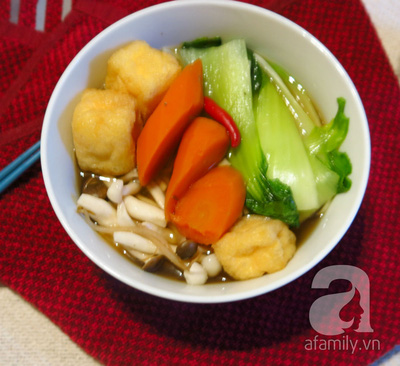 Tất cả đã sẵn sàng thì cho mì vào tô, cho cà rốt, đậu hũ, nấm, giá, và cải vào, chan nước dùng lên, cho tiêu và ớt vào là bạn có một tô mì nấm ngon, nóng, hổi cho bữa sáng. Nếu thích thịt bạn có thể trụng thịt bò vào nước dùng rồi sắp lên tô ăn cùng nhé!