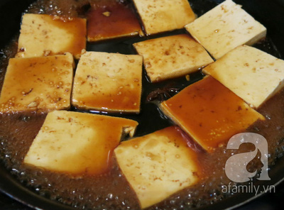 Cho vào chén khoảng 2 muỗng canh/thìa súp nước tương, 1 muỗng canh sốt nấm (mushroom sauce), thêm chút nước và 1 muỗng canh đường khuấy tan, cho vào chảo cùng 1 hoa hồi, cho đậu xắt miếng nhỏ vào, và để lửa liu riu thấm gia vị cho ngon. Nếu ai không thích ăn đậu kiểu này thì không cần làm chỉ cần dùng đậu chiên là được.