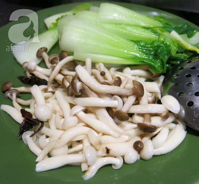 Cải tách bẹ và rửa sạch sẽ, ráo nước. Giá rửa sạch, để ráo nước. Cho một nồi nước thêm một muỗng canh dầu mè, chút muối và nấu sôi rồi trụng nấm, cải và giá. Vớt ra cho lên đĩa.