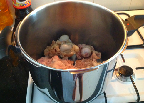 - Dứa gọt vỏ, thái khúc, sả cây rửa sạch, đập dập. Gừng rửa sạch, nướng sơ qua rồi cho vào nồi nước ninh chung với xương ống. Pha nước lọc với hai thìa canh mắm ruốc, lược qua rồi cho vào nồi nước dùng đang ninh.
