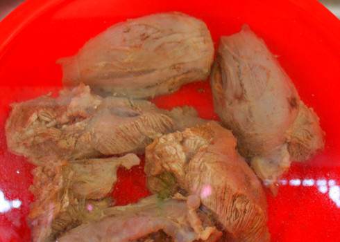 - Thịt bắp bò chín mềm vớt ra cho vào nước sạch để thịt nguội rồi vớt ra để ráo nước. Thịt bắp để nguội thái lát thịt sẽ không bị bể hay nát.