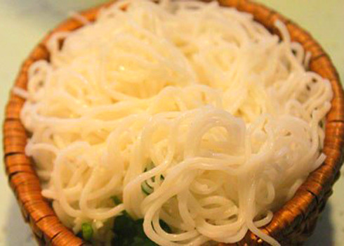 - Bún sợi lớn được chần sơ qua nước sôi rồi cho vào bát.
