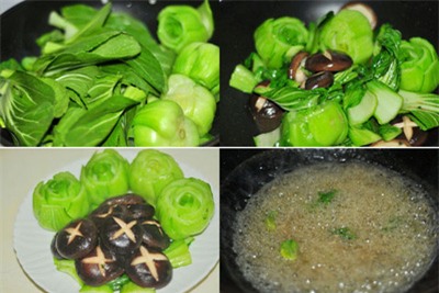 Nấm đông cô cắt bổ phần cuống nấm, rửa sạch, khứa 2 đường vuông góc trên mặt nấm vừa đẹp vừa thấm gia vị. Cải thìa rửa sạch, cắt ngang ở phần thân trắng của cây tạo hình bông hoa hồng. Đun nước sôi, chần 4 bông hoa hồng qua nước sôi. Bắt chảo lên bếp, làm nóng dầu cho đầu hành trắng, gừng đã băm vào, cho nấm đông cô vào xào.